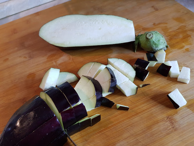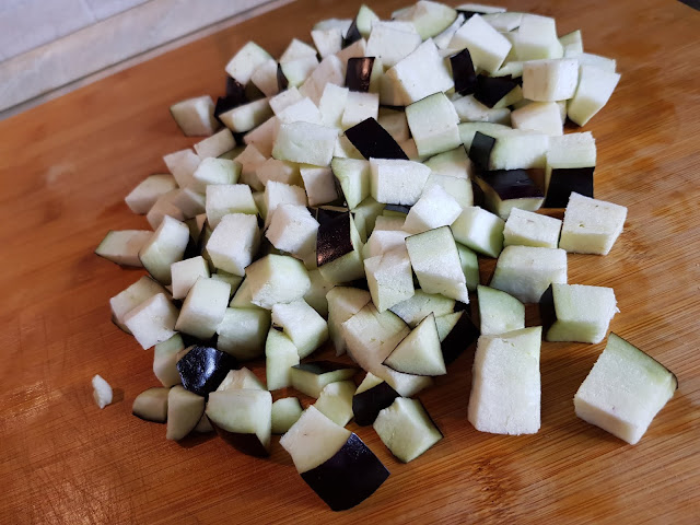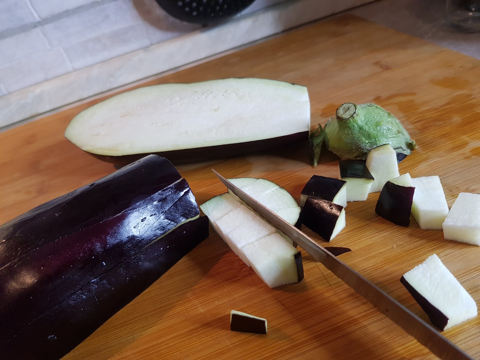 Lavate, pulite e tagliate le melanzane a piccoli pezzetti.