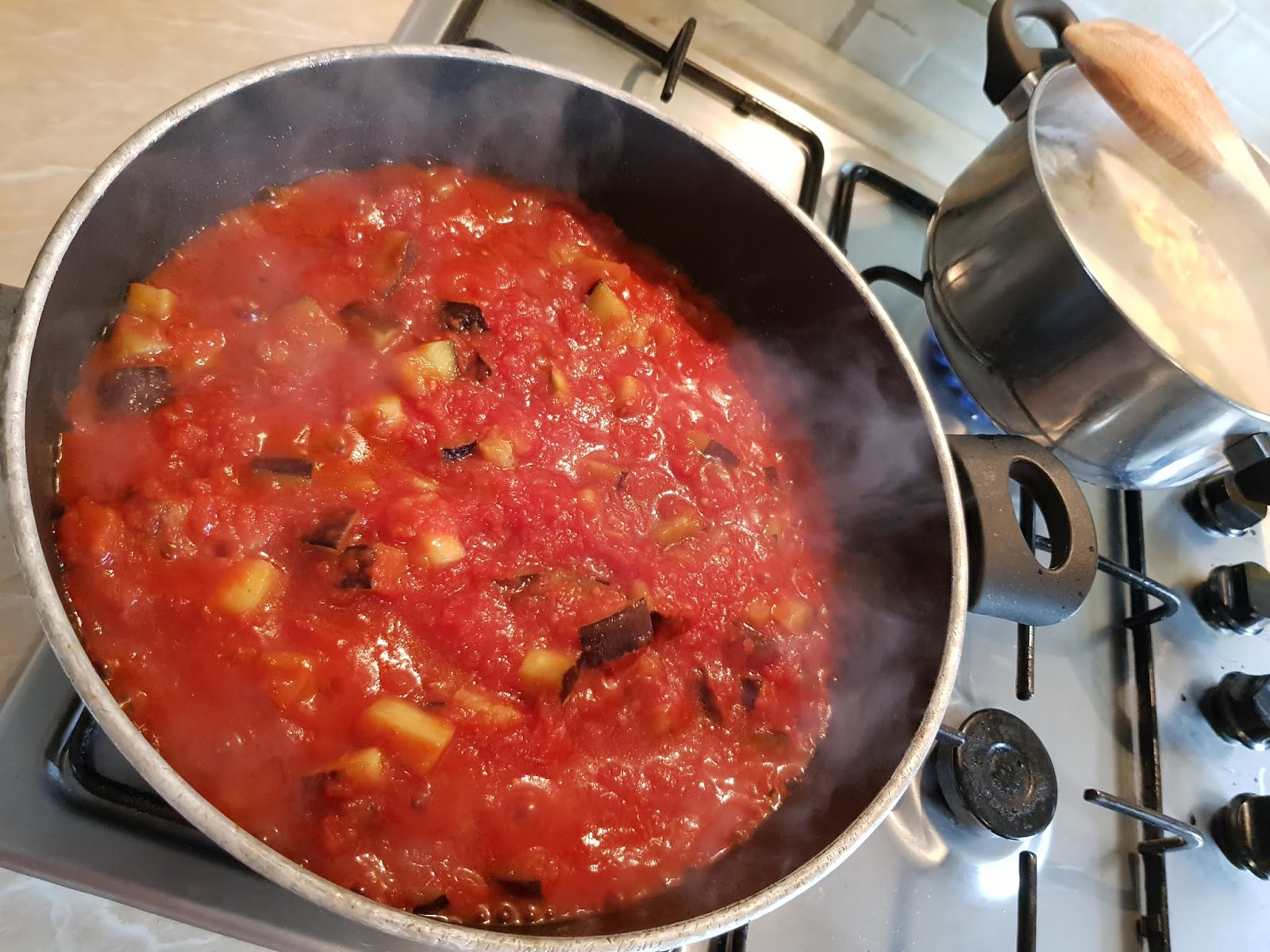Aggiungete il sugo di melanzane, i pezzetti di provola, pepe nero, parmigiano reggiano grattugiato.
